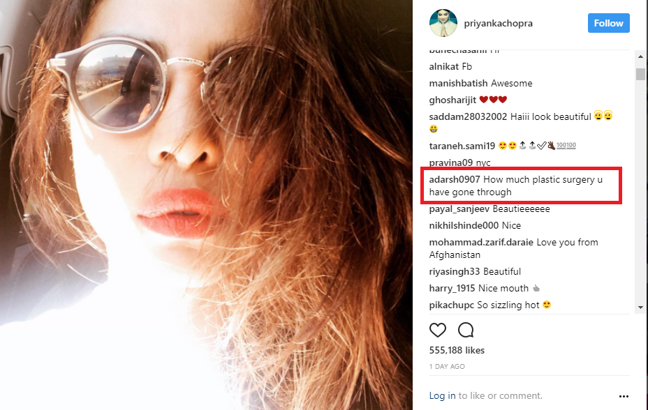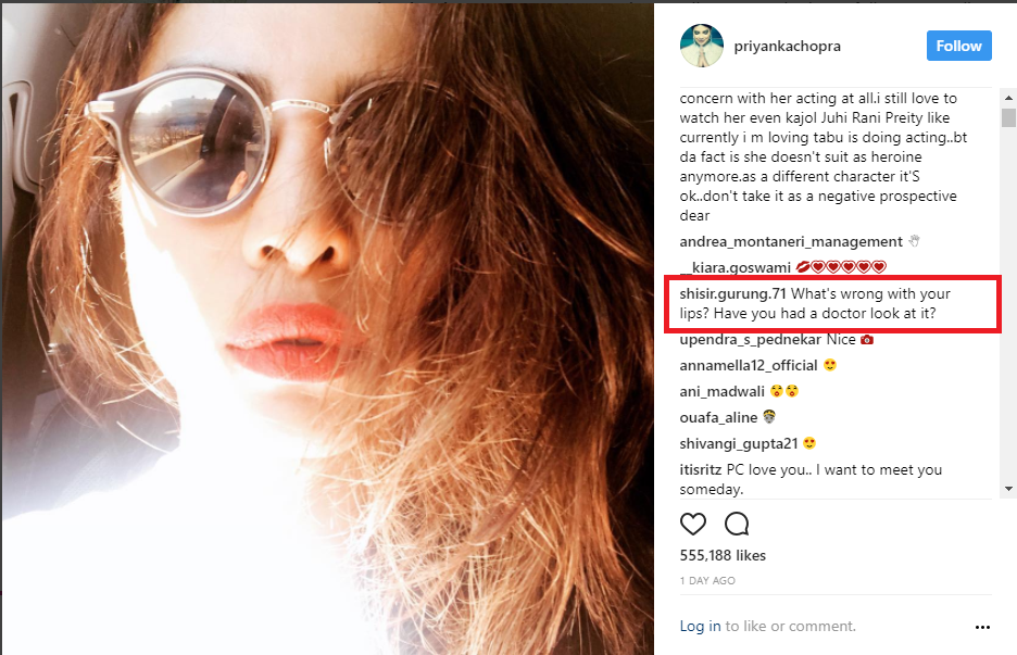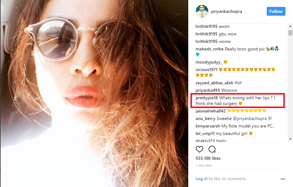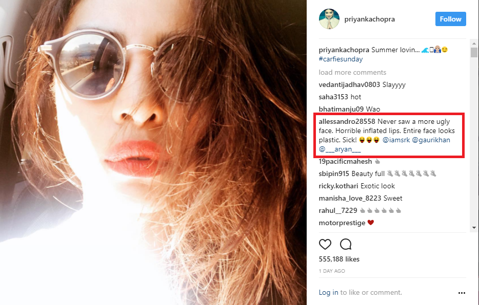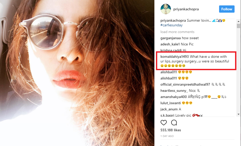 Social media trolls never stop and unfortunately our Bollywood stars are always at the receiving end even if they post something good. Priyanka Chopra especially has been the favourite of social media trolls. From the colour of her armpits to her lip-job, Priyanka does not get spared at all. Once again PeeCee had to hear nasty things about her lips as people started slamming her recent picture. The beautiful lady shared an extremely gorgeous selfie on Instagram. With sun kissing her cheeks and her lips forming a perfect pout, Priyanka captioned this picture as, “Summer lovin… ????? #carfiesunday.” But rather than concentrating on the beautiful photograph, all that people could talk about was her lips, which ‘apparently’ are inflated through surgery. (Also Read: Priyanka Chopra gets mercilessly trolled for her outfit during Prague tour)