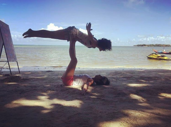 Taapsee Pannu and her sister Shagun strike a difficult Yoga position together.