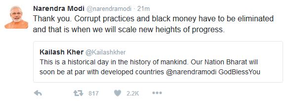 Prime Minister Narendra Modi last night announced that the notes of 500 and 1000 will be banned from November 9. Many Bollywood celebs like Karan Johar, Riteish Deshmukh, etc. tweeted in support of Modi, and the PM has thanked them. The official Twitter handle of the PM has been re-tweeting the celebs and thanking them for their support.