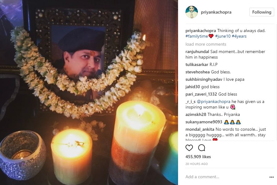 Priyanka captioned this pictures as, "Thinking of u always dad. #familytime❤️ #june10 #4years."