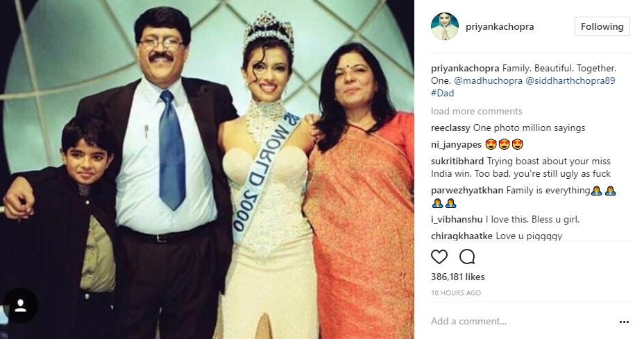 PeeCee captioned this picture as, "Family. Beautiful. Together. One. @madhuchopra @siddharthchopra89 #Dad."