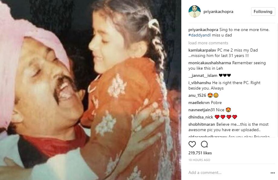 Priyanka captioned the picture as, "Sing to me one more time. #daddyandI miss u dad."