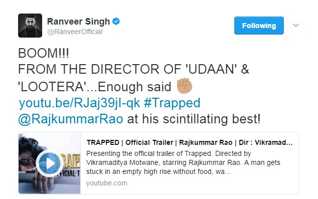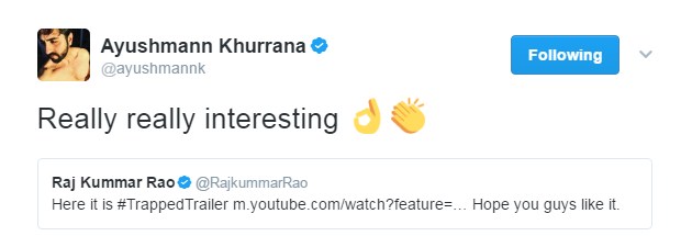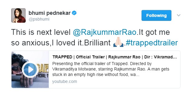 Looking forward to the release of this film eagerly, here we bring to you the favourable response of our B-Town stars on this film’s trailer. ‘Trapped’ is slated to release on March 17, 2017. (Also Check: PICS: Rajkummar Rao, Vikramaditya Motwane and team launch the trailer of ‘Trapped’)