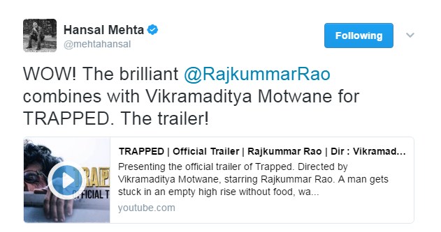 Hansal Mehta praises the trailer of Rajkummar Rao's 'Trapped'.