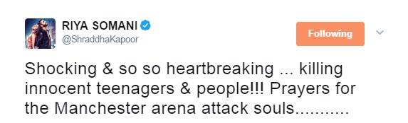 Shraddha Kapoor mourns for Manchester Arena victims.
