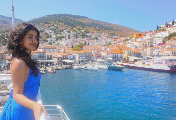 She captioned this picture as, "Even a bad hair day feels good when island hopping in Greece ?? That's the enchanting island #hydra in the background. Check out my insta stories for the days adventures ??"