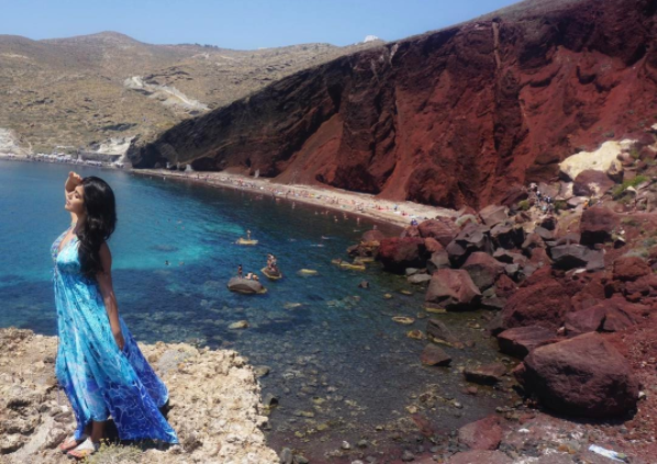 "?In Greek mythology, Sirens were dangerous women creatures, who lured nearby sailors with their music to shipwreck on the rocky coast of their island. Channeling my inner siren on the Red Beach Santorini. Beware Sailors ??," wrote Shenaz.