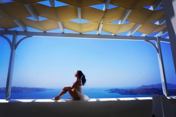 She wrote, "Good afternoon world ? Where are you today?? ??I'm in Greece ?? and in the most romantic place I have ever been to in my life. Fallen in ❤️ with Santorini with its white washed homes; blue skies and epic views! If you're looking for a honeymoon spot or a place to rekindle your relationship- this is it!"