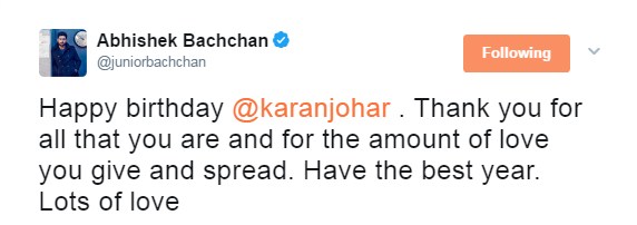 Abhishek Bachchan wishes Karan Johar on latter's birthday.