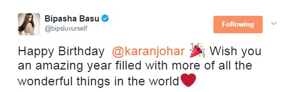 Bipasha Basu wishes Karan Johar on his birthday.