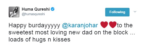 Huma Qureshi wishes Karan Johar on his birthday through this message on her Twitter handle.