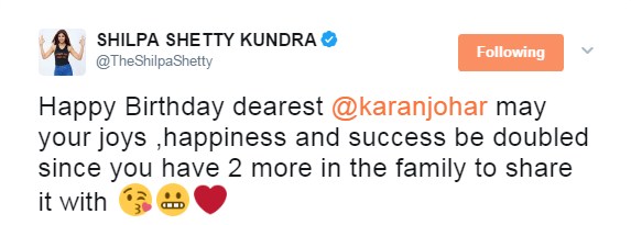 Shilpa Shetty Kundra sends her good wishes to Karan Johar on his birthday.