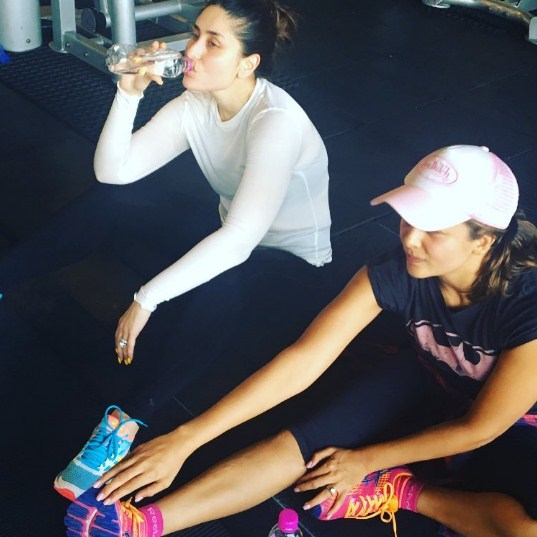 Kareena Kapoor Khan is seen taking a break post her workout session with friend Amrita Arora Ladak.