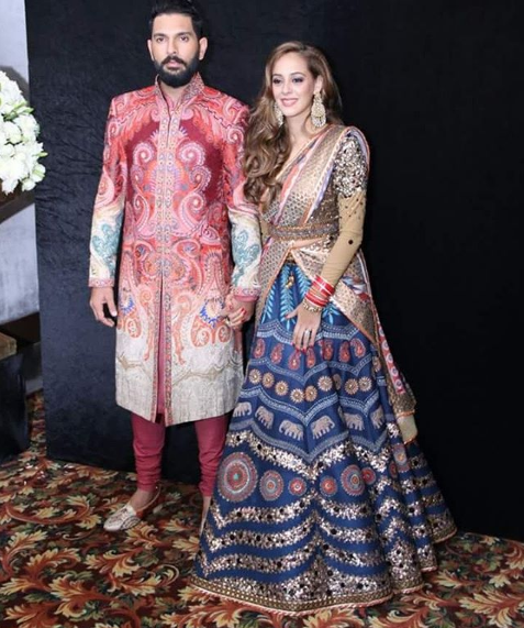 Yuvraj looked suave and dapper in a bandhgala and jodhpuri pants while his pretty wife Hazel looked mesmerizing in a blue-green lehenga. From cricketers like Sachin Tendulkar, Mahendra Singh Dhoni, Harbhajan Singh, to B-town celebs like Angad Bedi, Neha Dhupia, Rannvijay Singh, Norah Fatehi, many celebrities dropped in to wish the newly weds.
