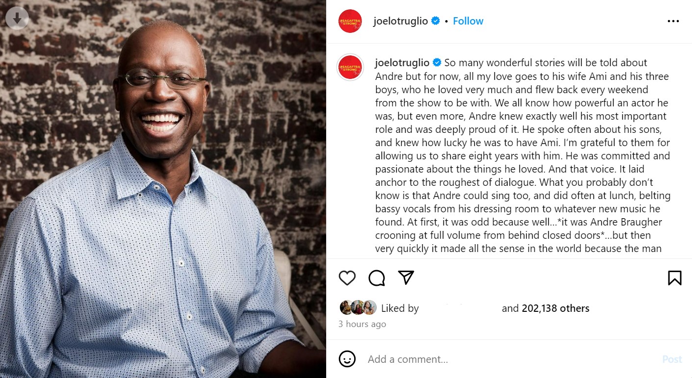 Joe Lo Truglio, who played Detective Charles Boyle recalled what a proud father Andre was to his sons. He said, “We all know how powerful an actor he was, but even more, Andre knew exactly well his most important role and was deeply proud of it. He spoke often about his sons, and knew how lucky he was to have Ami. I’m grateful to them for allowing us to share eight years with him.” He also revealed how amazing of a singer the late actor was.