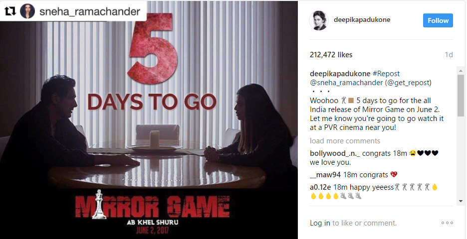 Following this, we have Deepika Padukone who is wooting for ‘Mirror Game’. She reposted Sneha Ramachander’s post that said 5 days to go for ‘Mirror Game’.