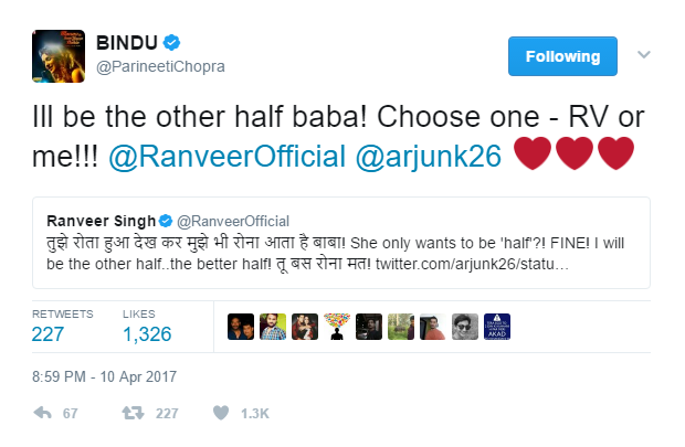 Well, Parineeti Chopra came in this conversation, and tweeted, “Ill be the other half baba! Choose one – RV or me!!! @RanveerOfficial @arjunk26.”