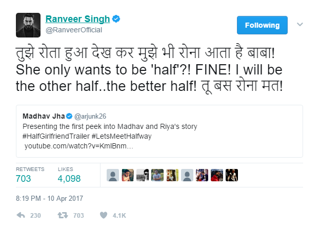 After seeing the trailer of the film, Ranveer tweeted, “तुझे रोता हुआ देख कर मुझे भी रोना आता है बाबा! She only wants to be ‘half’?! FINE! I will be the other half..the better half! तू बस रोना मत!”