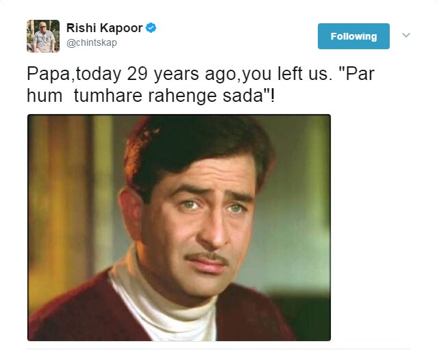 The veteran actor had written , “Papa,today 29 years ago,you left us. “Par hum tumhare rahenge sada”!” [sic] This line is taken from Raj Kapoor’s iconic song ‘Jeena Yahan Marna Yahan’ from ‘Mera Naam Joker’ (1970). Co-incidentally this is the same movie which marked Rishi Kapoor’s debut in Bollywood as he was seen playing the younger version of the character played by his father. (Also Read: A mark to remember: When Raj Kapoor burnt his hand, for a promise)