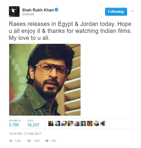 We already know that SRK is a global star and has fans spread across the world. And the SRK fans in Egypt and Jordan can rejoice now as the actor recently announced that ‘Raees’ has been released in both the countries. Shah Rukh took to his Twitter account yesterday and wrote, “Raees releases in Egypt & Jordan today. Hope u all enjoy it & thanks for watching Indian films. My love to u all.”