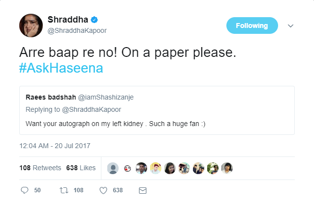 Fans can go to any extent to get attention from their beloved star, there is no doubt about it. And if you don’t believe this, then just check this request made by one of the die-hard fans of ‘Baaghi’ star Shraddha Kapoor. The actress indulged in a Twitter chat with her fans recently using the hashtag #AskHaseena and that’s when one of her fans asked her to give an autograph on his left kidney. As much as it may sound absurd, but that’s what he really asked for. Flattered and flabbergasted at the same time, the only thing Shraddha could do was to politely refuse him by stating that she would give him an autograph only on paper.