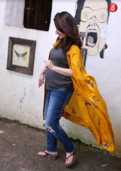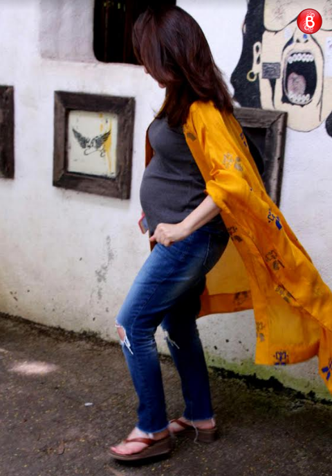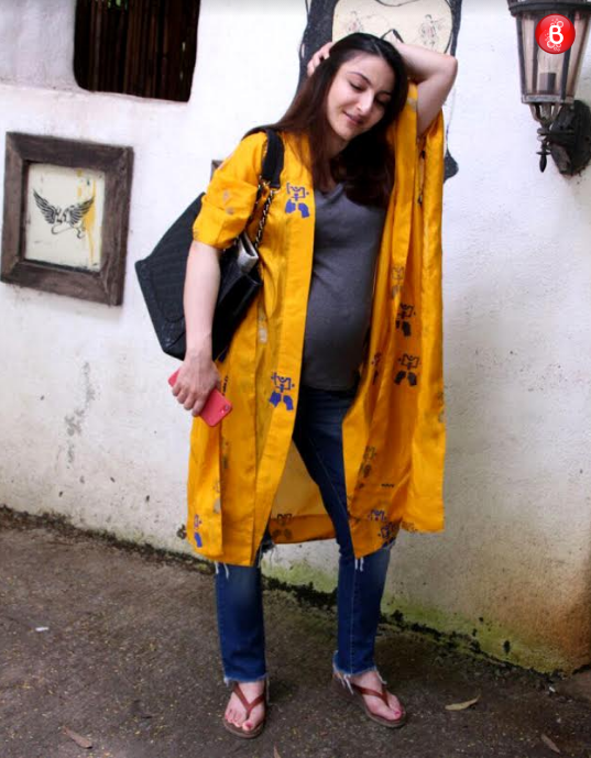 This morning, the actress was clicked outside a salon in Bandra. Wearing a grey-coloured tee-back vest with a yellow long shrug and tattered blue jeans, Soha looked glamorous as she flaunted her baby bump.
