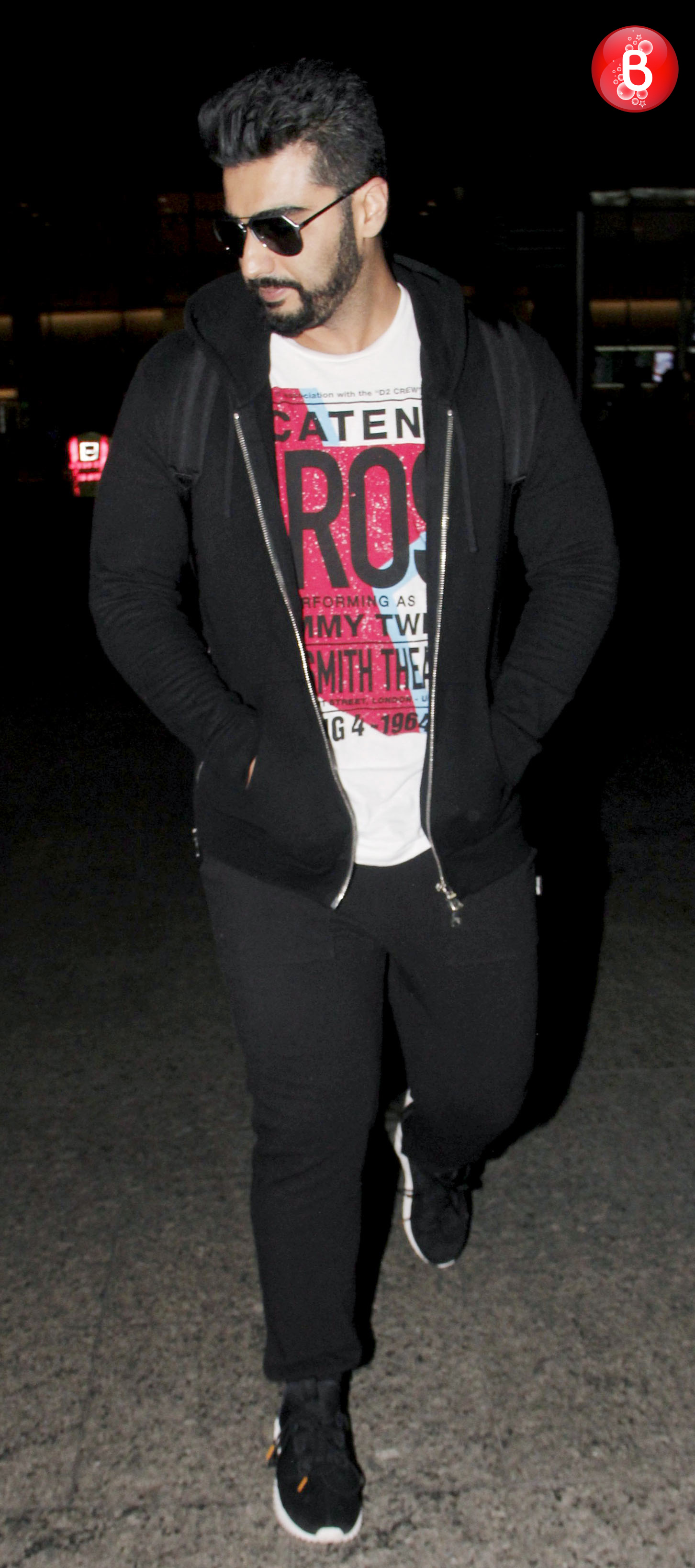 Arjun Kapoor opted for a black trouser, a white printed tee shirt and a confy jacket.