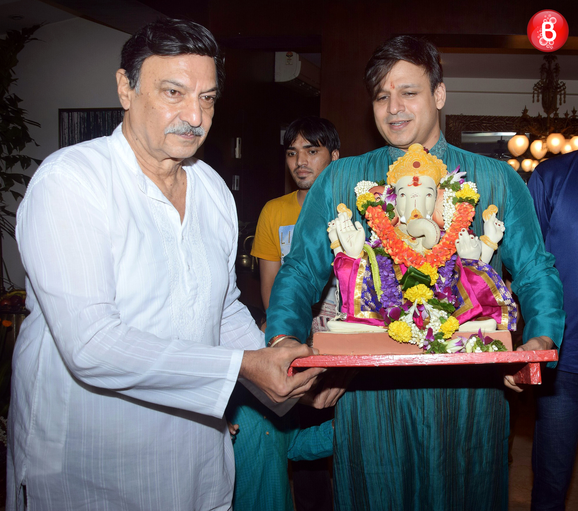 Suresh Oberoi and Vivek Oberoi outside their house, all set for Ganpati visarjan.