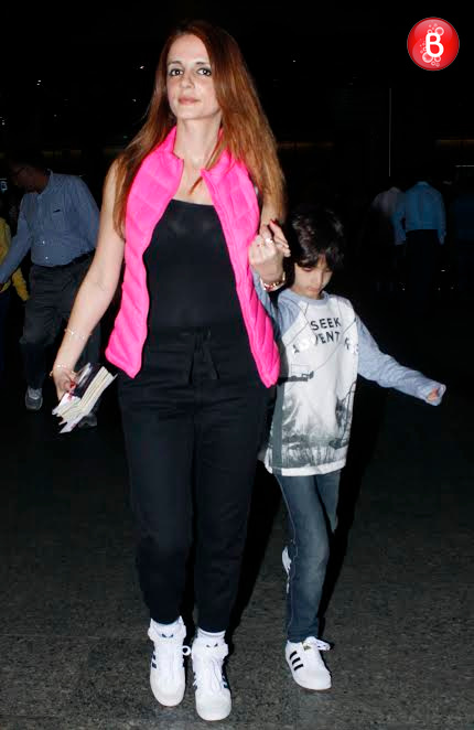 Sussanne Khan had gone for a trip to Dubai to welcome the New Year with her kids Hrehaan and Hridhaan Roshan. Even actor and her ex-husband Hrithik Roshan had joined them there but returned earlier for the promotions of his upcoming release ‘Kaabil’. On Thursday, our cameramen spotted Sussanne returning from her trip along with the kids and accompanied by her brother Zayed Khan as well. Apart from them, actress Shilpa Shetty Kundra was even clicked with her hubby Raj Kundra and son Viaan Raj Kundra here as they came back home from their vacation trip enjoying the New Year.