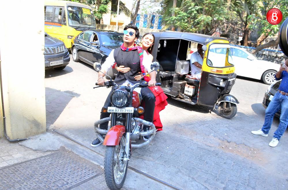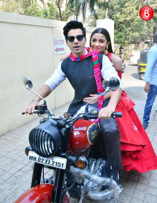 Varun Dhawan and Alia Bhatt arrive together at the trailer launch on a bike.