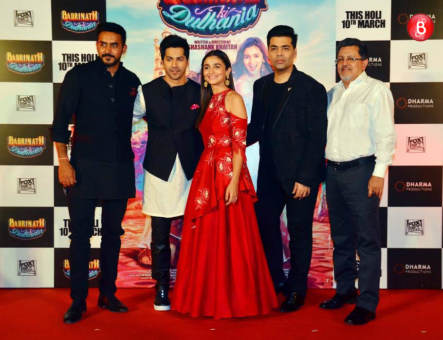 Varun Dhawan, Alia Bhatt pose for the camera along with director Shashank Khaitan and producer Karan Johar at the trailer launch event.