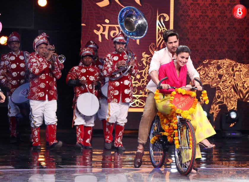 The fun-loving ‘Badrinath’, aka actor Varun Dhawan and his on screen dulhania, actress Alia Bhatt, are travelling for the promotions of their film ‘Badrinath Ki Dulhania’ everywhere. On Tuesday, the talented duo took their cute little cycle and made a grand entry along with the band baaja on the sets of popular singing reality TV show ‘Indian Idol 7’. Both of them had a blast shooting for this episode along with the judges Farah Khan, Anu Malik, Sonu Nigam and the participants. This is quite evident from these pictures clicked on sets.