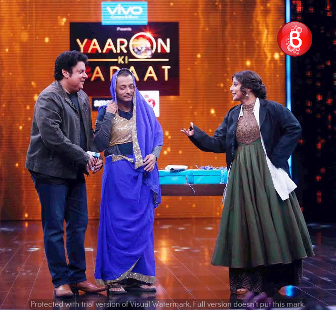 ‘Kahaani 2‘, the much awaited second edition of ‘Kahaani’ franchise hit the theatres today and great reviews are pouring in from all corners already. Meanwhile, Vidya Balan and director Sujoy Ghosh were on the sets of Sajid Khan and Riteish Deshmukh’s chat show ‘Yaaron Ki Baraat’ last evening. From Sujoy dressing up as a woman to Vidya posing as a weird man, they had all the fun! Even before the episode airs, we have glimpses from the sets! Check out.