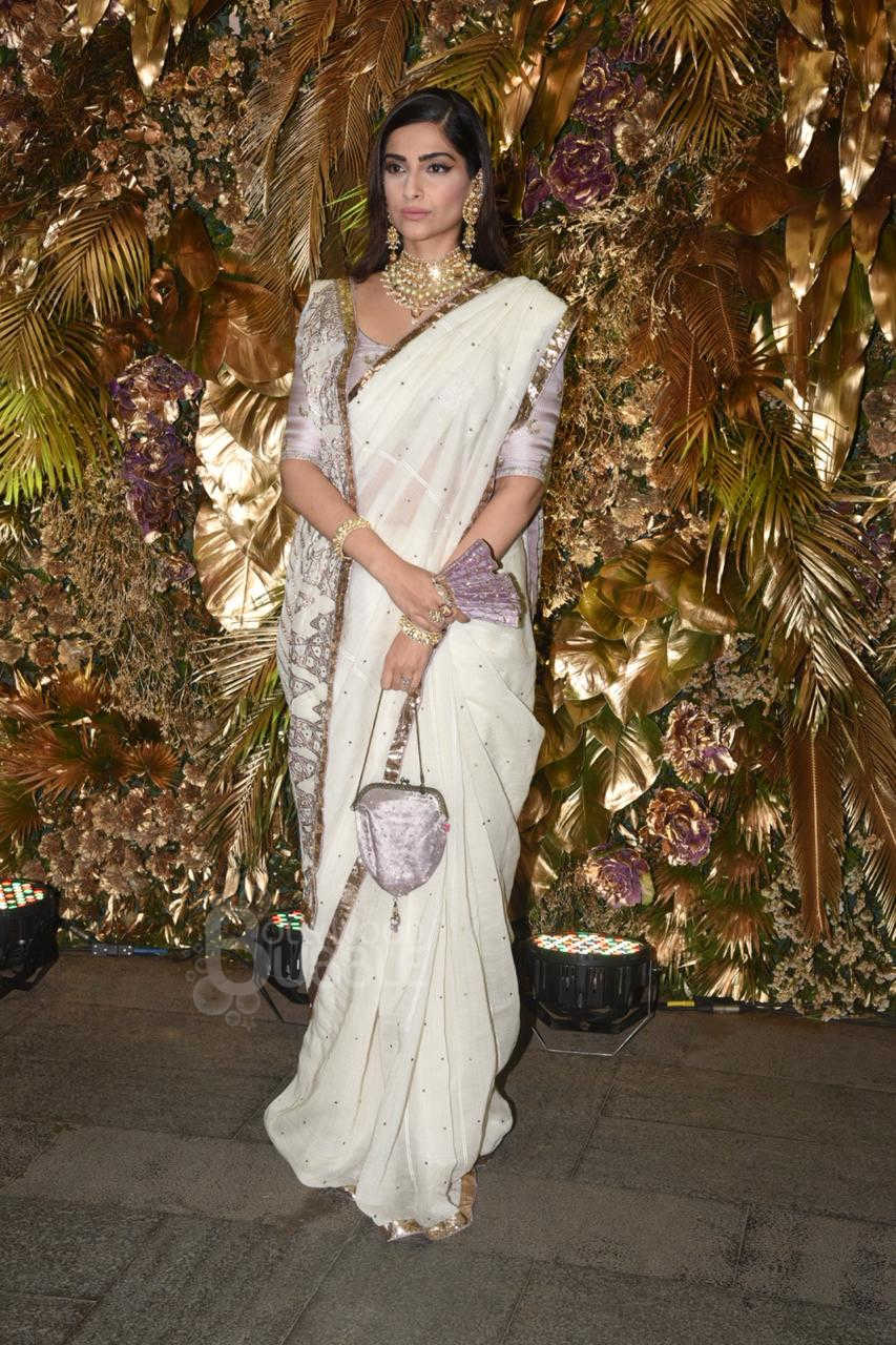 The pretty actress, Sonam Kapoor too marked her attendance at the wedding reception. She wore a white saree.
