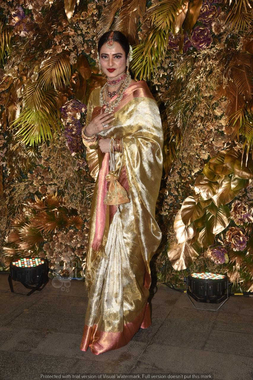 The ever green actress, Rekha appeared in her statement style. She carried a shimmery border saree for the reception.