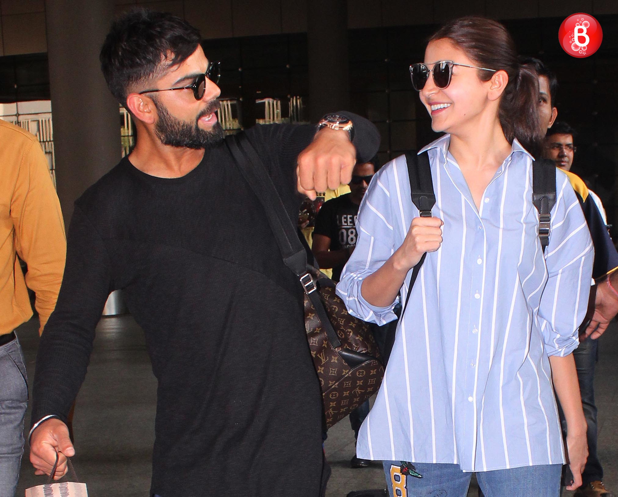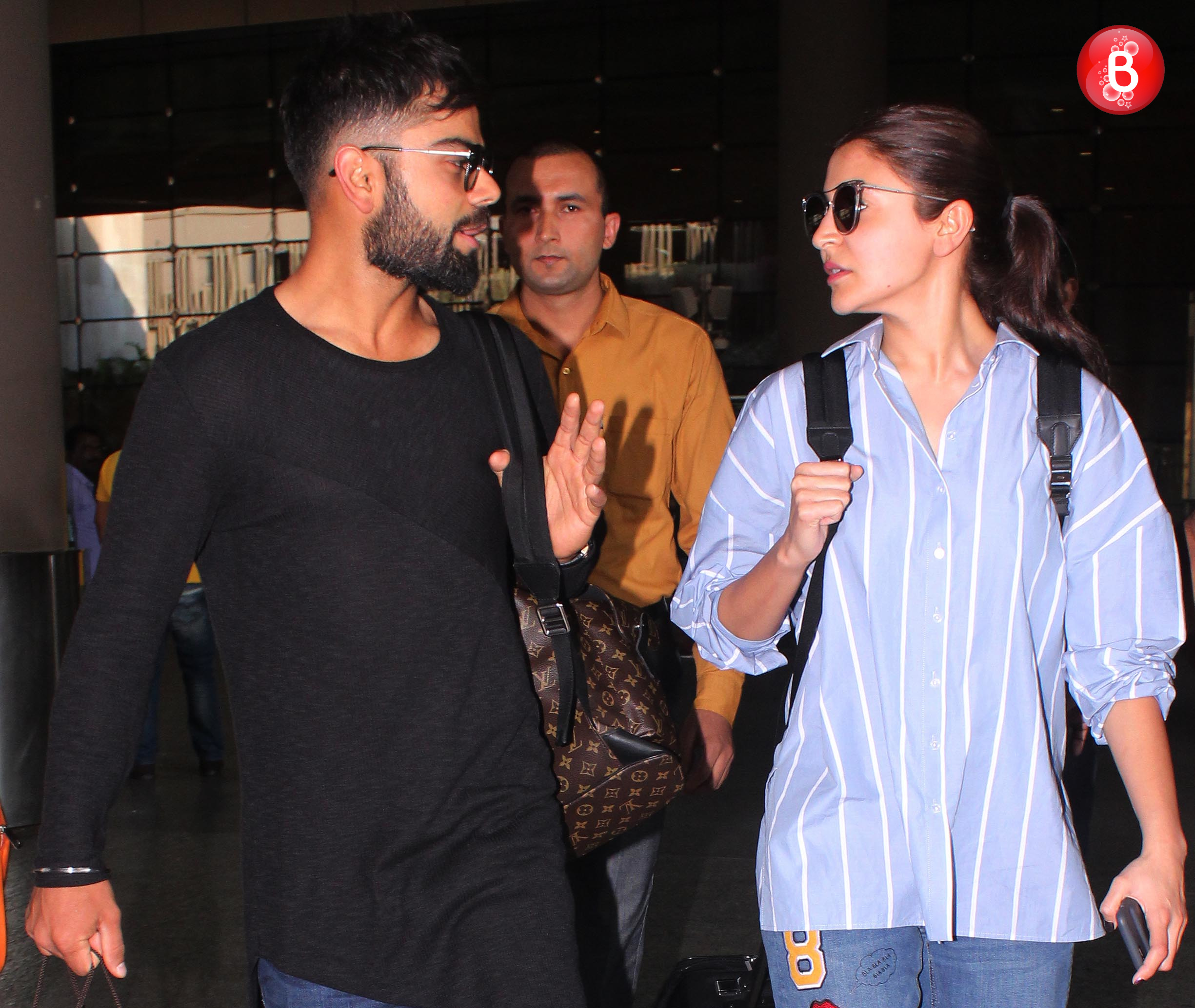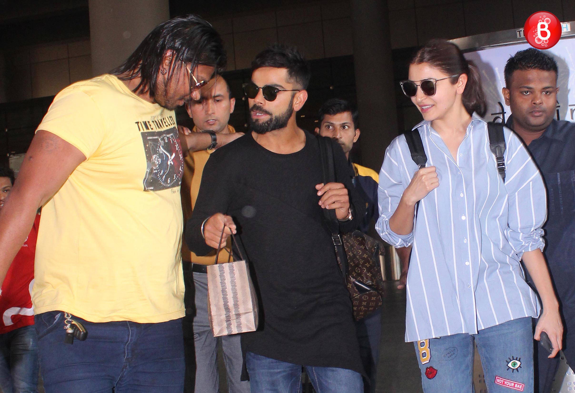 Virat Kohli and his superstar girlfriend Anushka Sharma had flew down to Goa to attend Yuvraj Singh and Hazel Keech’s wedding. Looking their very best, Anushka and Virat were the center of attraction at the wedding. We watched the video of the two dancing their heart out with the married couple. Well, after all the fun and excitement, Virat and Anushka are back in town. Our shutterbugs spotted them at the airport and the two looked so happy together. Despite a rough patch that their relationship suffered in between, Virat and Anushka have been inseparable lately.