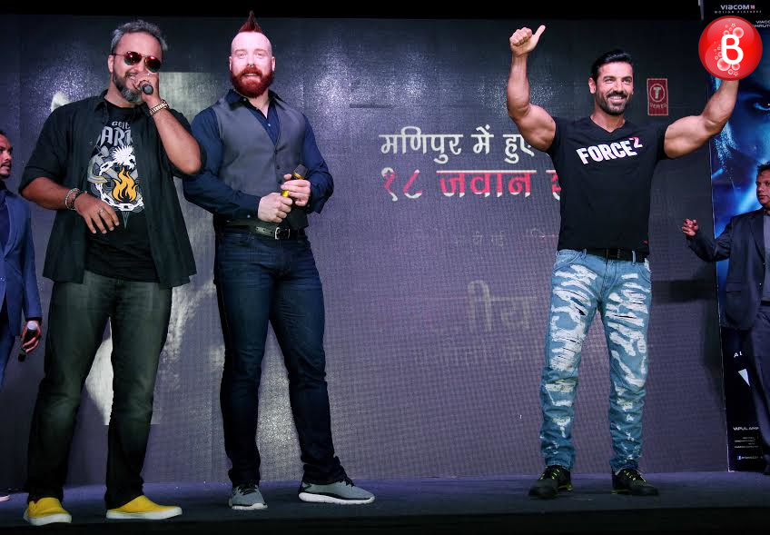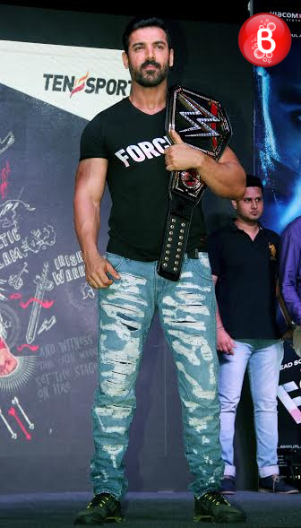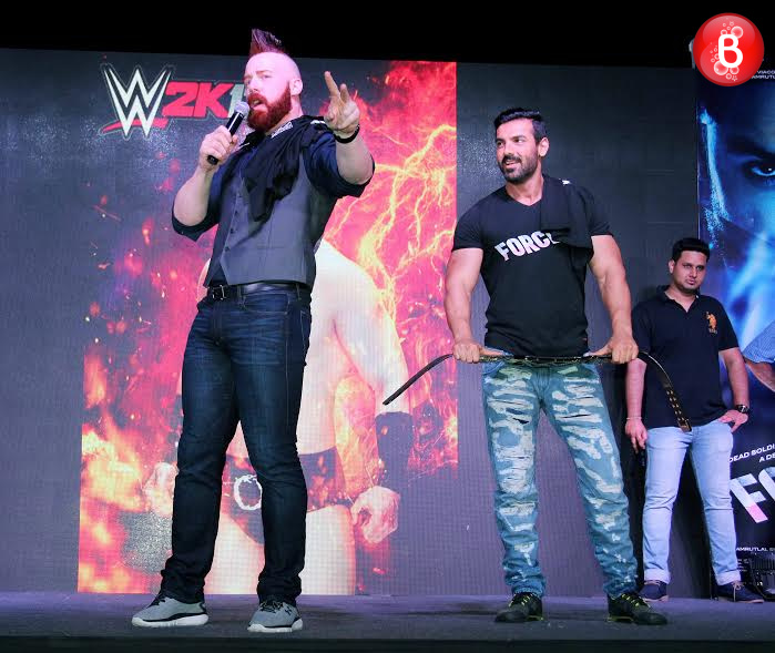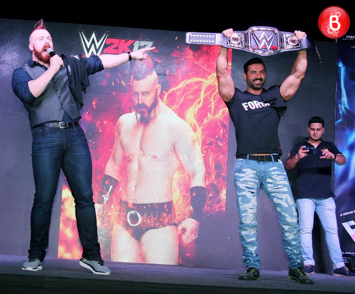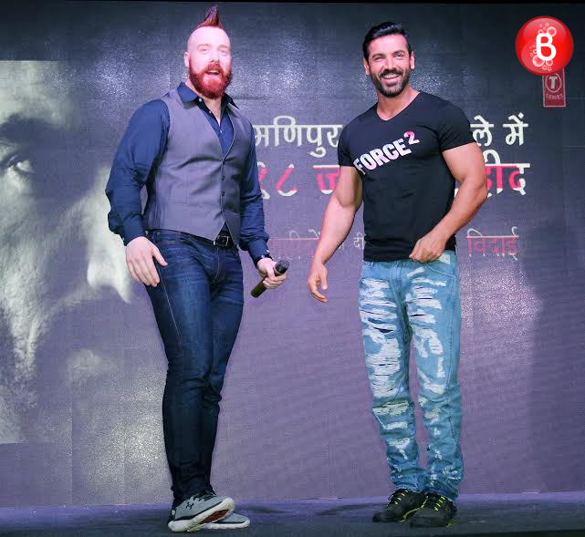 Bollywood’s macho hunk, actor John Abraham has already kick-started the promotions of his upcoming film ‘Force 2’ which is an action thriller. On Friday, during one such promotional event, the actor shared the stage with none other than the WWE heavyweight champion Sheamus. Stephen Farrelly, popularly known by his screen name Sheamus even challenged the ‘Rocky Handsome’ actor here adding up to the excitement level of their fans. The event was followed by many such enthralling moments like the one when Sheamus handed over the WWE heavyweight championship belt to John Abraham. And here we bring to you those pictures from this event.
