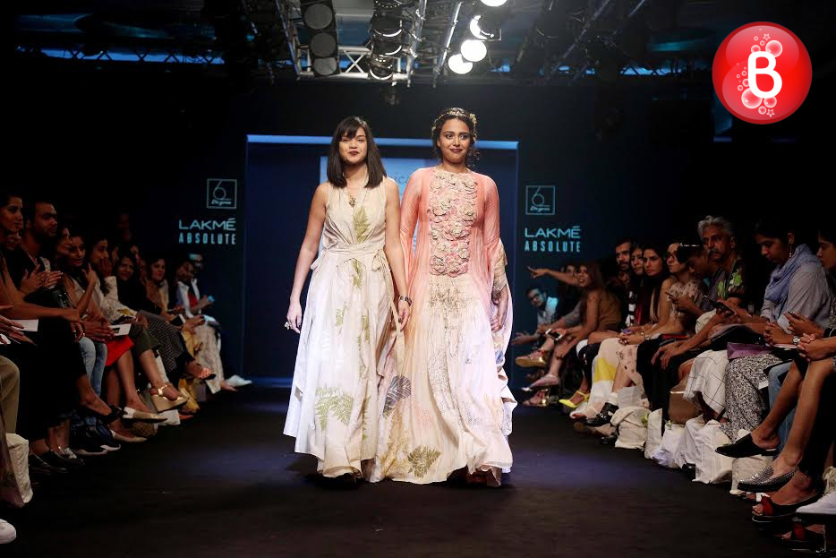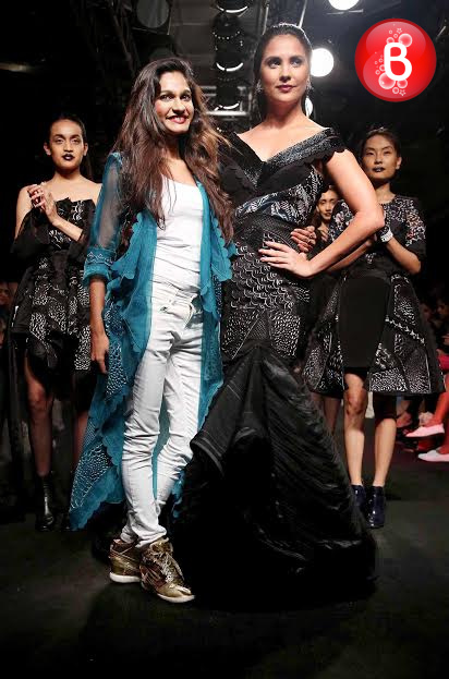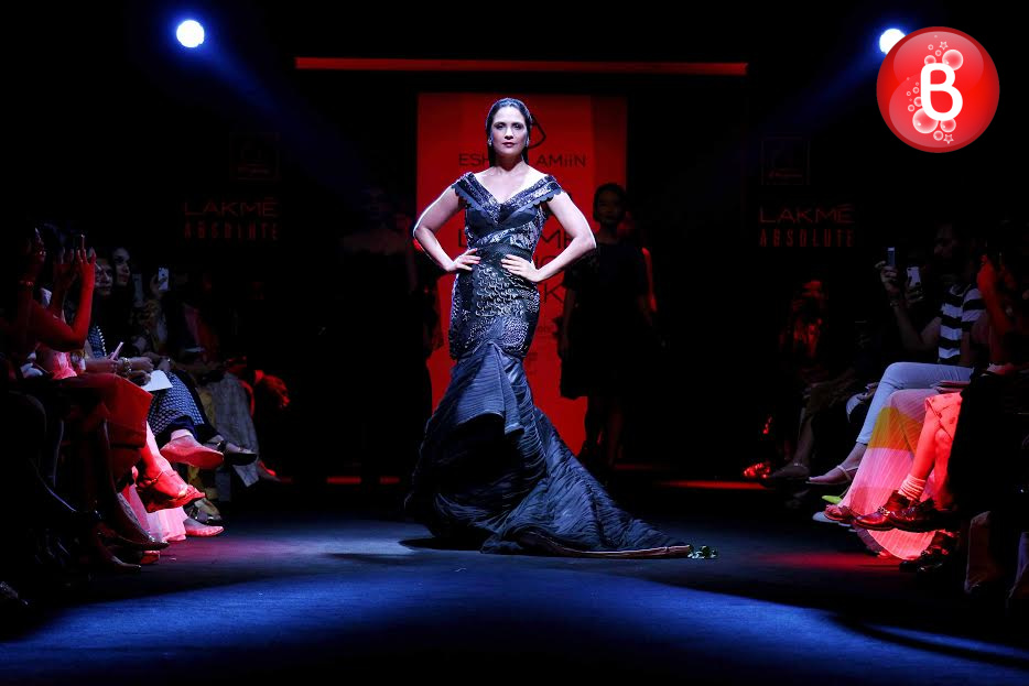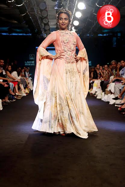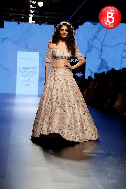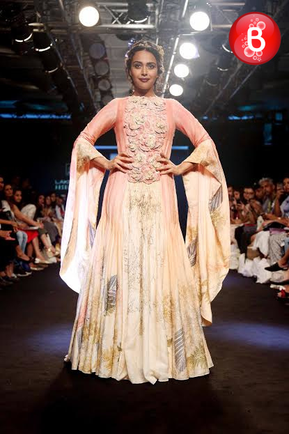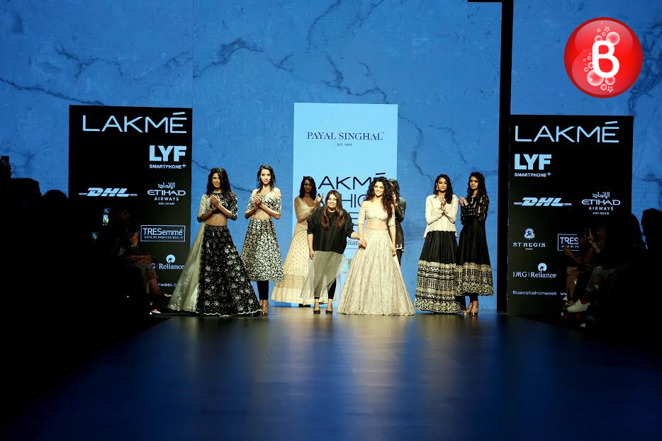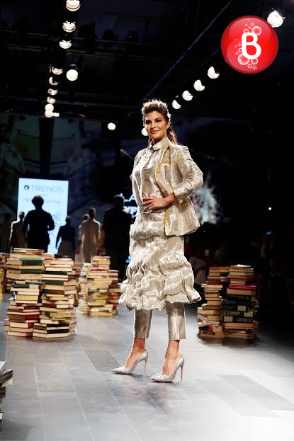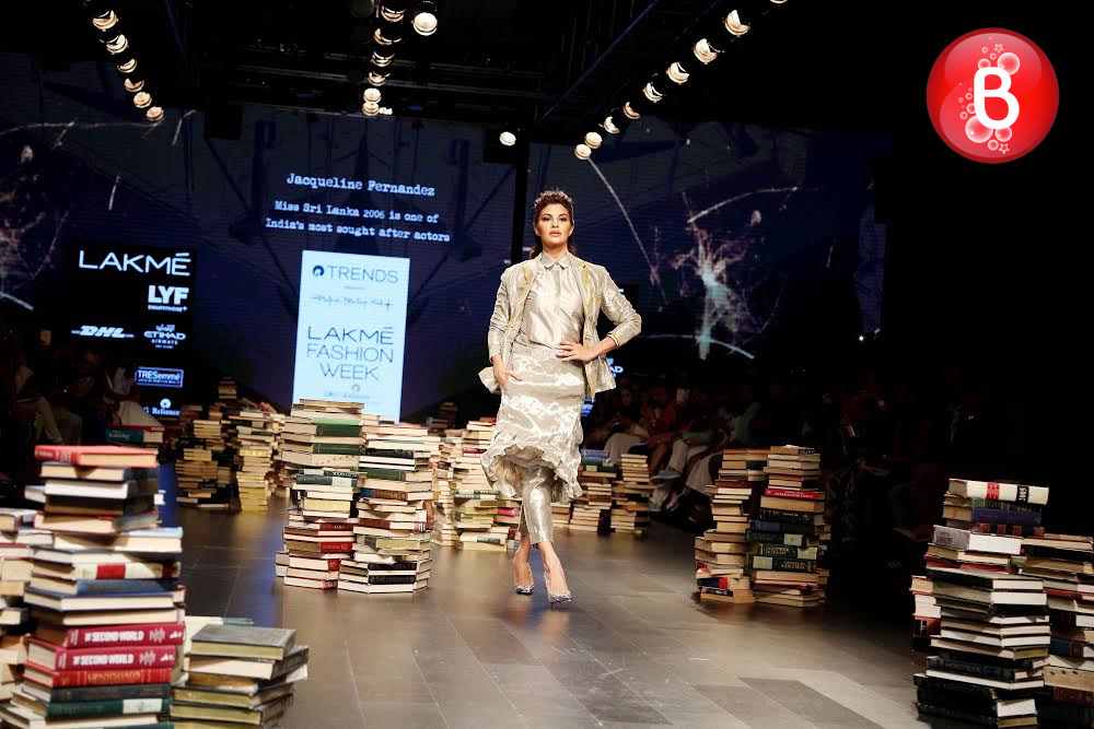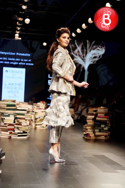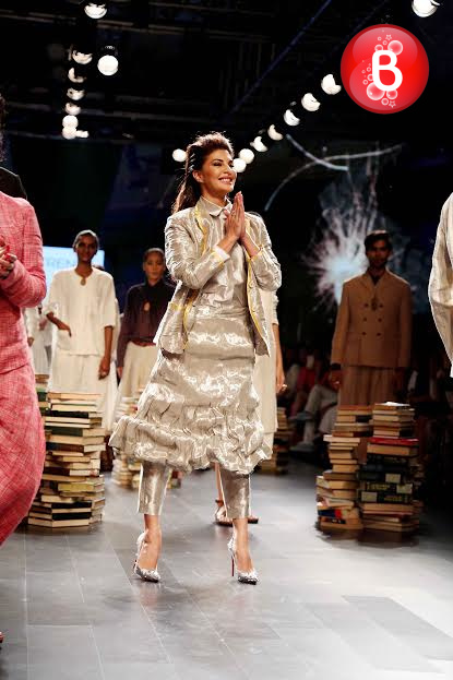 The ongoing Lakme Fashion Week (LFW) Winter/Festive 2016, saw the stunning beauty Jacqueline Fernandez walking on ramp as a showstopper for the collection of designer Rajesh Pratap Singh. Friday was the third day of the event, wherein she was seen dressed in a shimmering jacket, simple shirt, crimped crushed flouncy skirt over cropped pants. This was the last show of Day 3, and apart from Jacqueline, B-Town actresses like Swara Bhaskar, Manisha Koirala, Lara Dutta and soon to make her debut with ‘Mirzya’ Saiyami Kher were also seen as showstoppers for ace designers. With their elegant appearances on the ramp, here we bring some pictures from this magnificent fashion event.