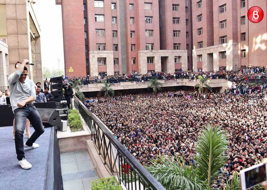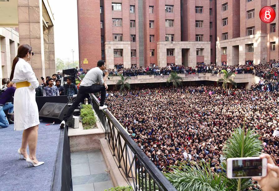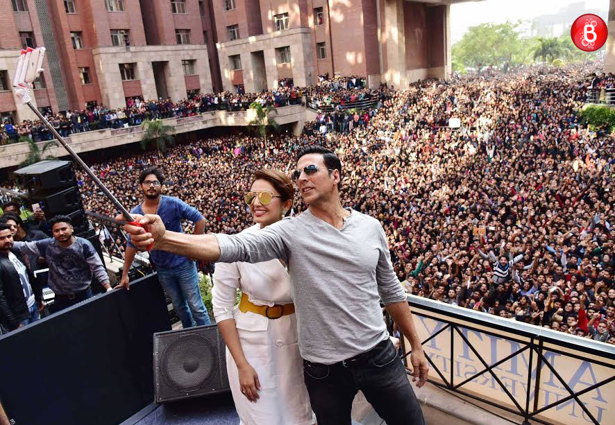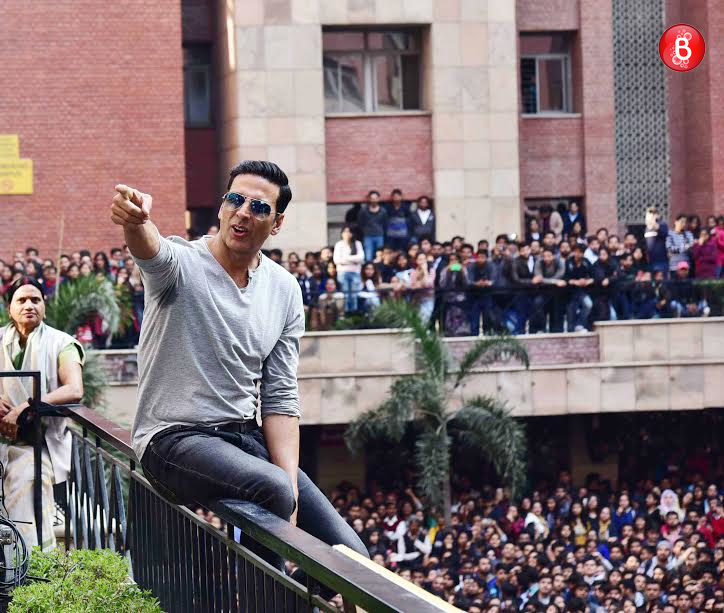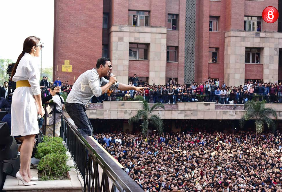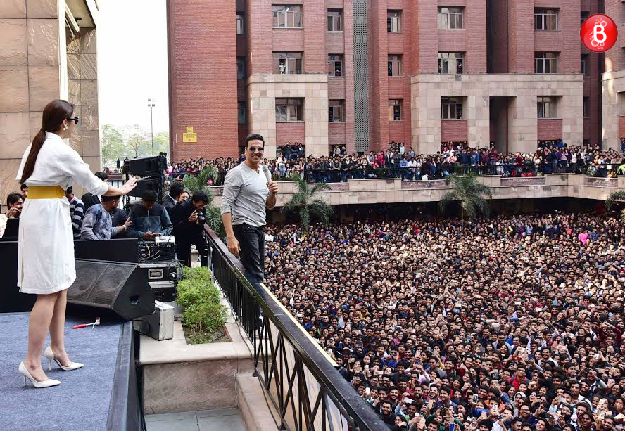 Akshay Kumar and Huma Qureshi are snapped interacting with their fans at Amity University Noida.