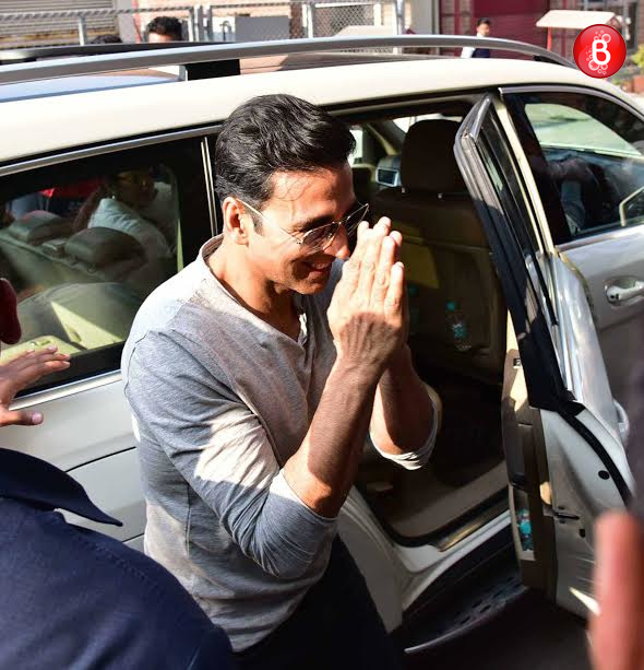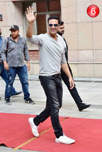 Akshay Kumar is snapped waving to his fans as he takes a leave from the venue.