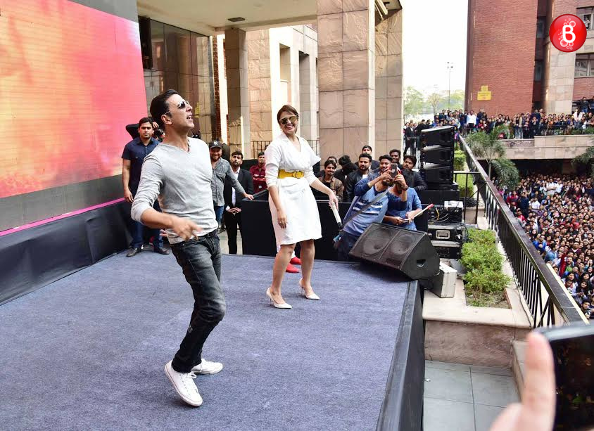 With just few days left for the release of ‘Jolly LL.B 2’, the lead pair Akshay Kumar and Huma Qureshi are currently on a promotional spree. Both of them reached Delhi today, and made their way to the Amity University Noida for an interaction with their fans. The event (interaction) witnessed the presence of nearly a thousand students who were captured peaking from every nook and corner of the large institute to catch the glimpse of Akshay and Huma. Both the stars had a fun filled interaction, and Akshay even danced to his old superhit track ‘Chura ke dil mera goriya chali’ along with Huma. Certainly, both Akshay and Huma spent some good moments here at the promotional event and had a jolly good time before they left the venue.