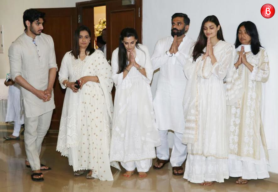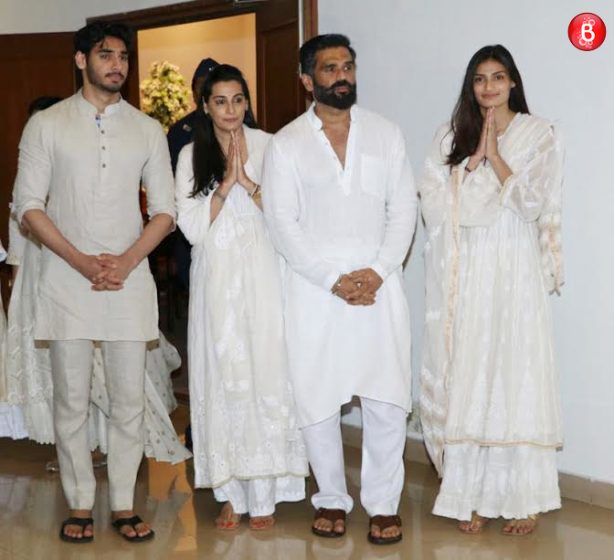 Suniel Shetty at his father's ‘chautha’ ceremony along with his wife Mana Shetty, kids Ahan and Athiya Shetty.