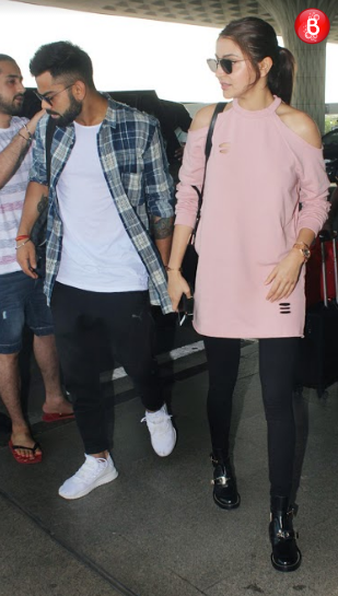 While we were not treated to any romantic post on Anushka Sharma‘s birthday by her cricketer beau Virat Kohli, our shutterbugs spotted the couple at Mumbai airport this morning. Anushka sported a cold shoulder top and black skinny jeans which she paired with ankle length boots whereas Virat donned a white T-shirt and black jeans with checkered shirt and white sneakers. (Also Read: Anushka Sharma announces her next production venture titled ‘Pari’)