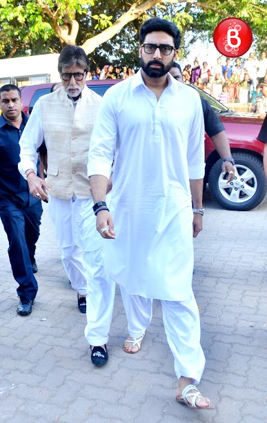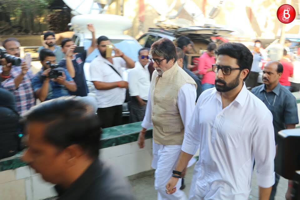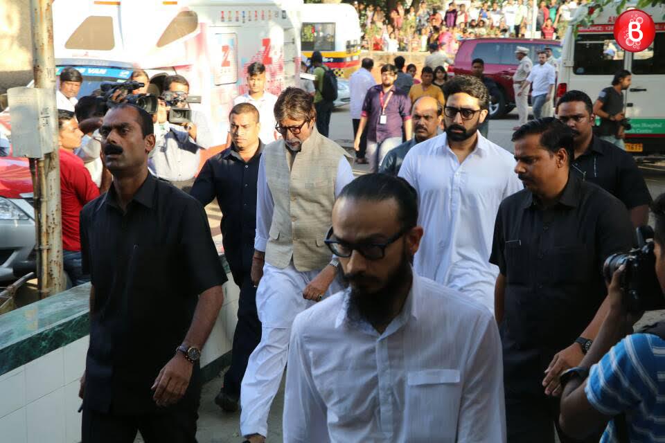 Amitabh Bachchan and Abhishek Bachchan at Vinod Khanna's funeral.