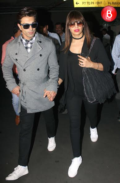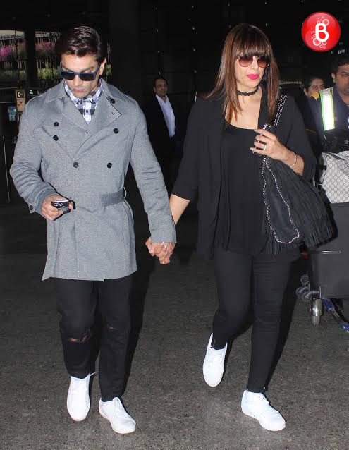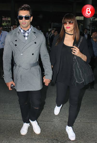 Bipasha Basu and Karan Singh Grover were recently snapped at the Mumbai airport. Hand in hand, the much-in-love couple walked. But what caught our attention was their superb fashion sense. They looked so synchronised in monotone that we couldn’t help but sigh. While Karan Singh Grover looked dapper in grey trench coat and sunnies, Bipasha Basu looked simply rock and chic in black. With her new hair bangs, Bips sported a complete black outfit and paired it with crimson lips and a choker. Another cute fact is that both Karan and Bips twinned on footwear wearing matching white sneakers.