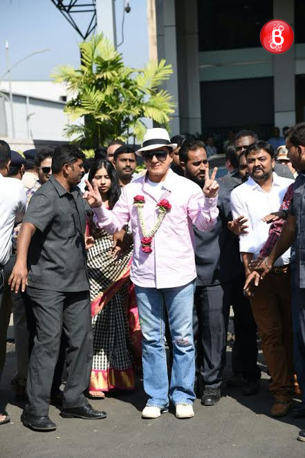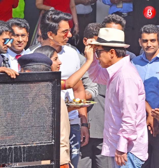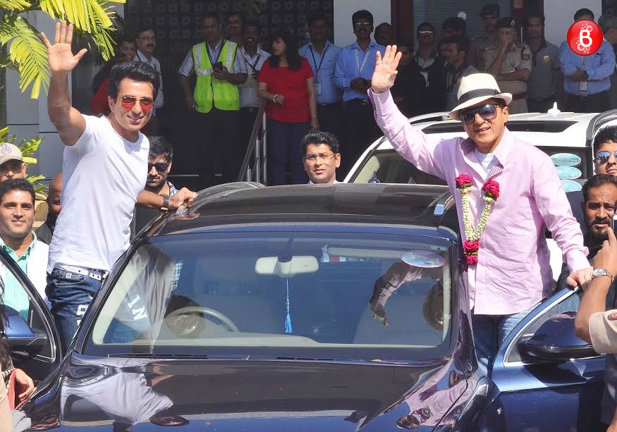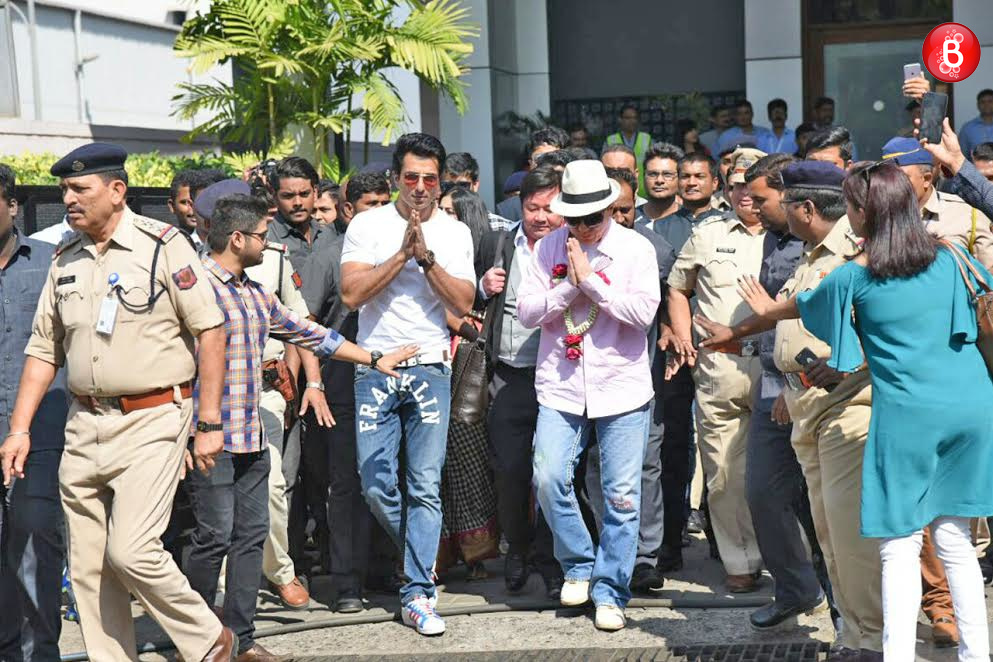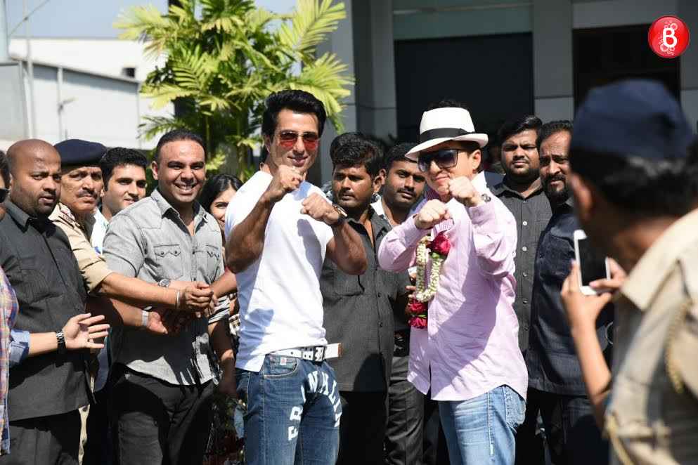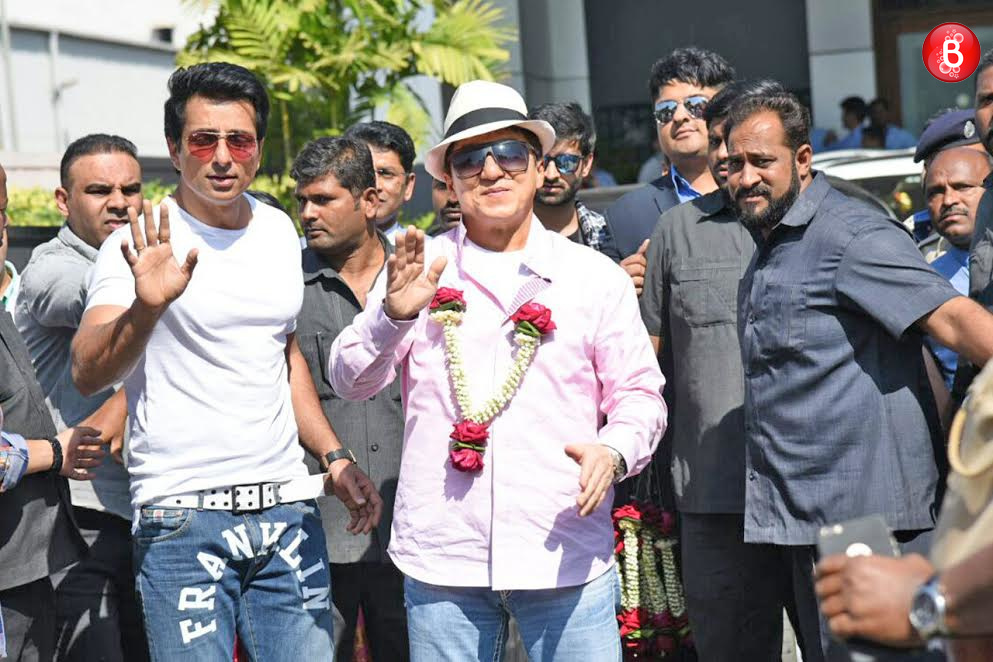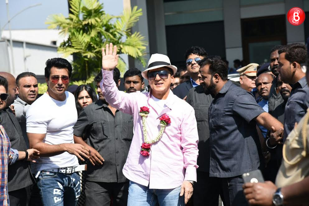 Jackie Chan and Sonu Sood are captured doing Namaste to their fans waiting out there.