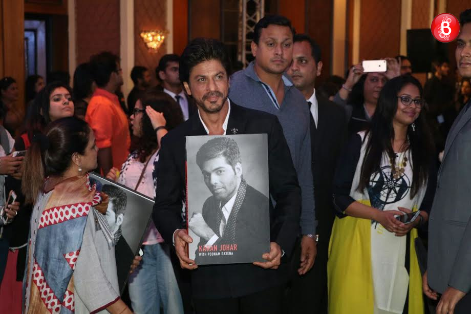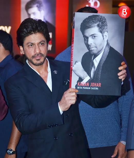 Shah Rukh Khan poses with the book cover of Karan Johar's autobiography.