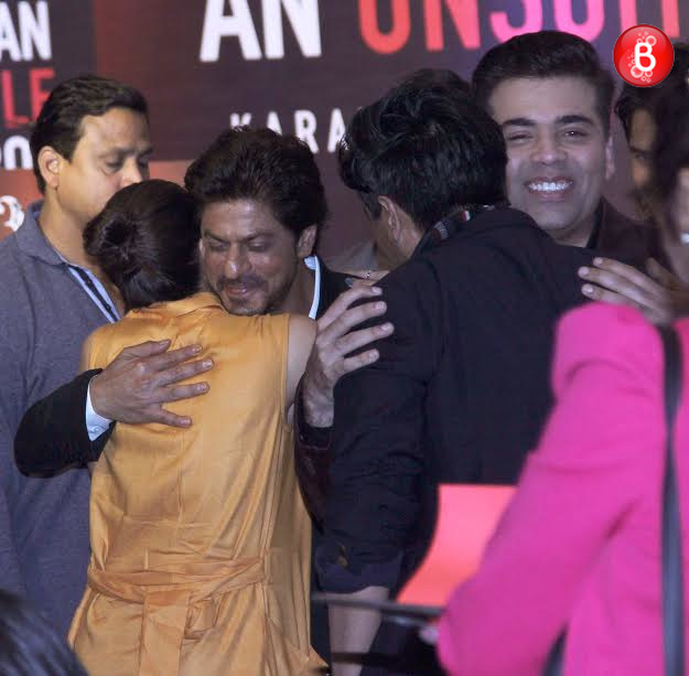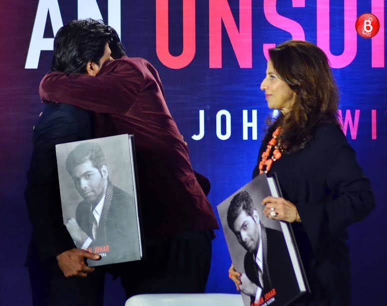 Karan Johar gives a hug to his friend Shah Rukh Khan at his autobiography launch.