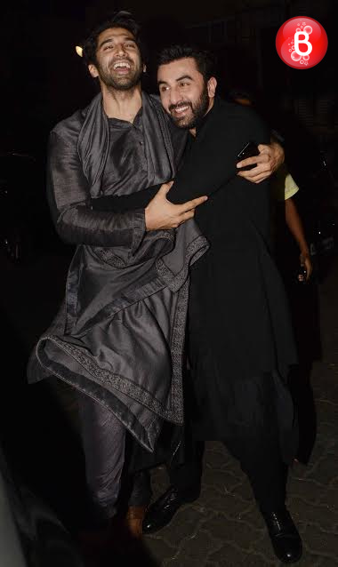 As the celebrations of Diwali festival is carried out in galore, a lot of B-Town friends have been seen spending a gala time together. One such example of bromance was seen between Ranbir Kapoor and Aditya Roy Kapur. Both of them had arrived at Anil Kapoor’s residence to attend the Diwali party. As Ranbir reached the venue, he greeted his fans first; following which he started interacting with Aditya before entering the party. After some time, Ranbir was seen picking up his dear friend Aditya. Certainly, it was quite a pleasant moment to see these friends in such a jolly mood. Further, both of them were snapped meeting actor Arjun Kapoor as well. Ranbir and Aditya have previously worked together in ‘Yeh Jawaani Hai Deewani’.