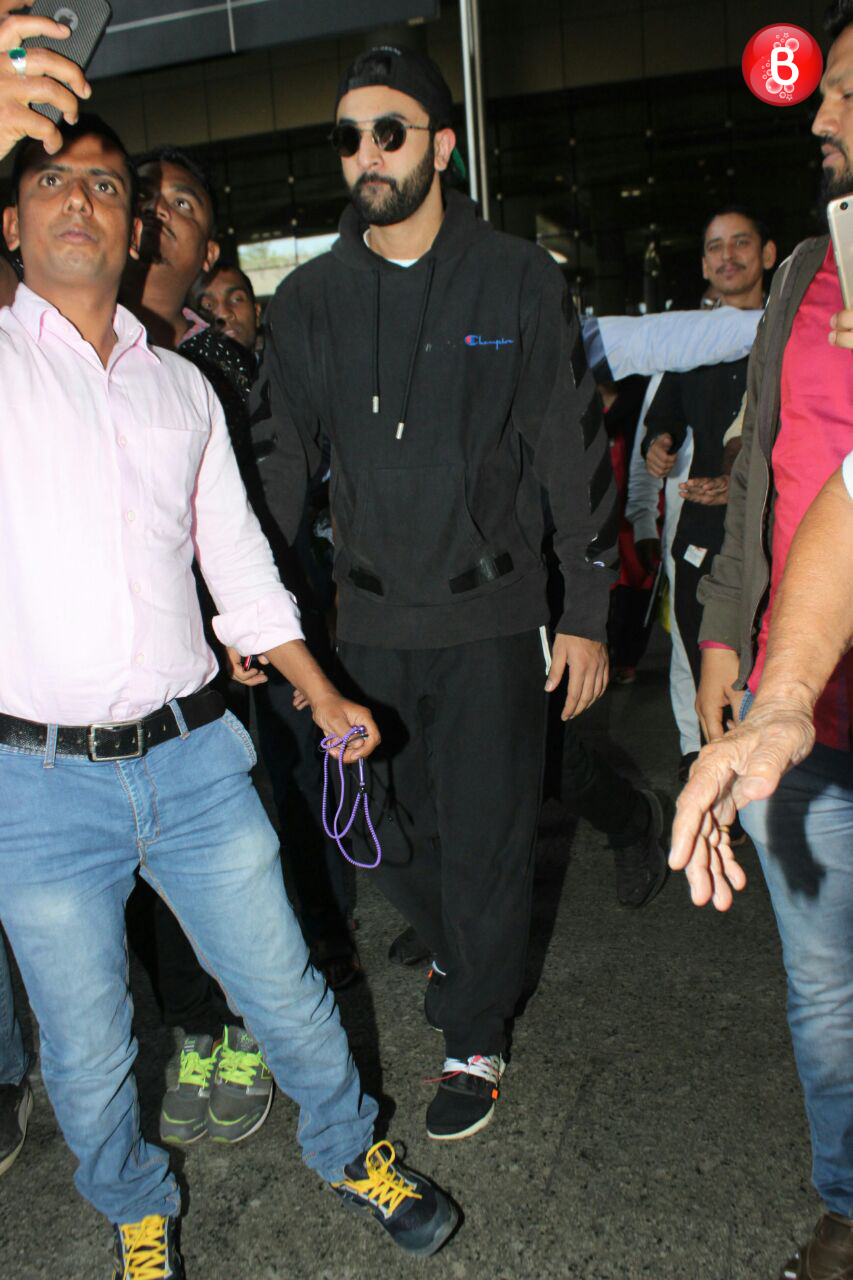 Yesterday, actor Ranbir Kapoor completed 10 years in Bollywood and a photo of him holidaying with his mum Neetu Kapoor popped up on her instagram page straight from Berlin.. This morning, the actor was back in Mumbai and was clicked at the airport. He was wearing a dark grey sweatshirt with black track pants, a black hat and black glares. An overdo of coverup also didn’t work in his favour and the star was instatntly mobbed by the people at the airport. Until his solo pics were being clicked, Ranbir Kapoor looked fine but he was visibily uncomfotable with so many people trying to take a selfie with him. (Also Read: Ranbir Kapoor’s version of #BomDiggy the Snapchat way is way too hilarious!)